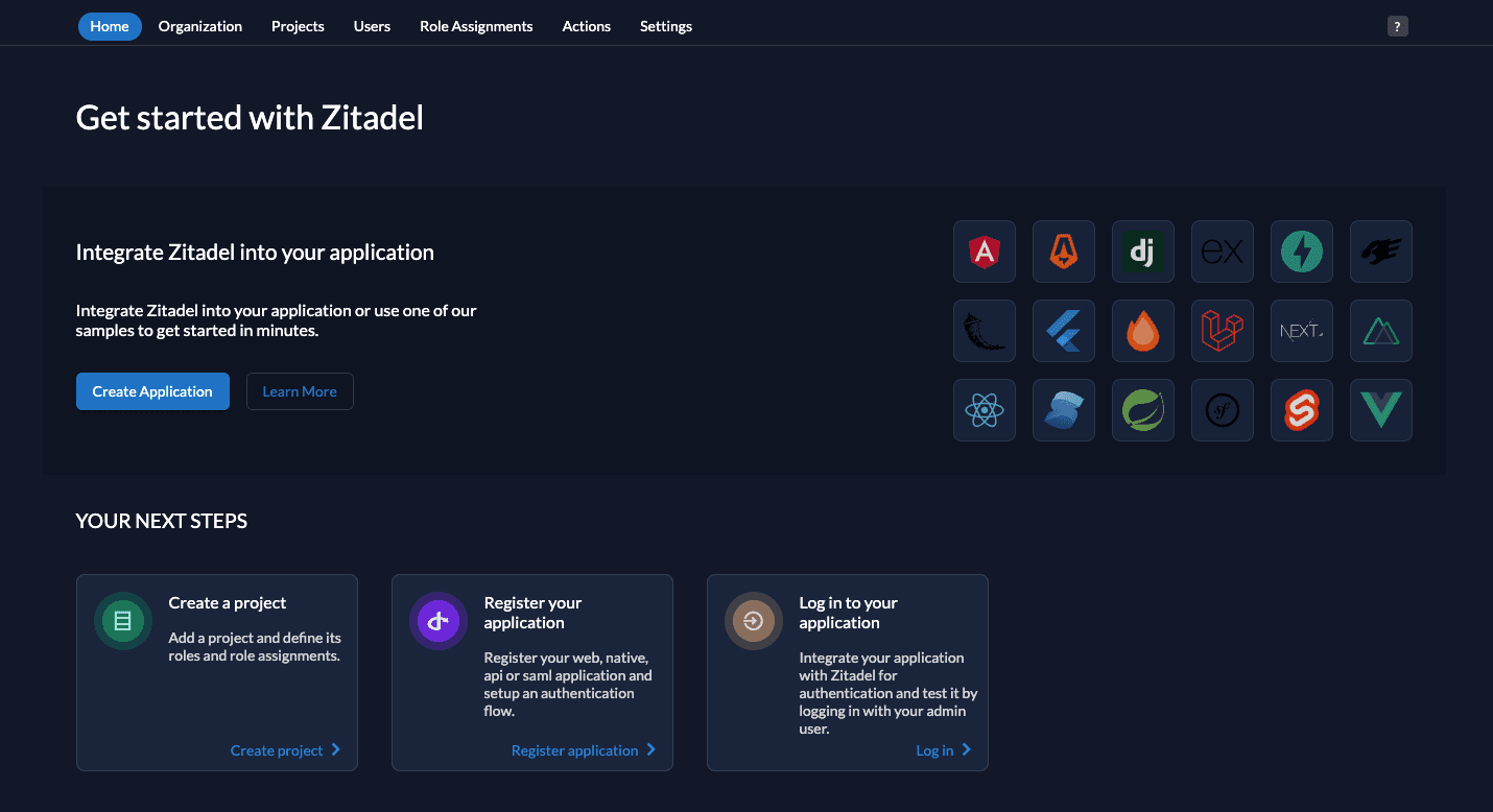 So let's create the role and grant it to the user. To do so, go to your project in ZITADEL Management Console