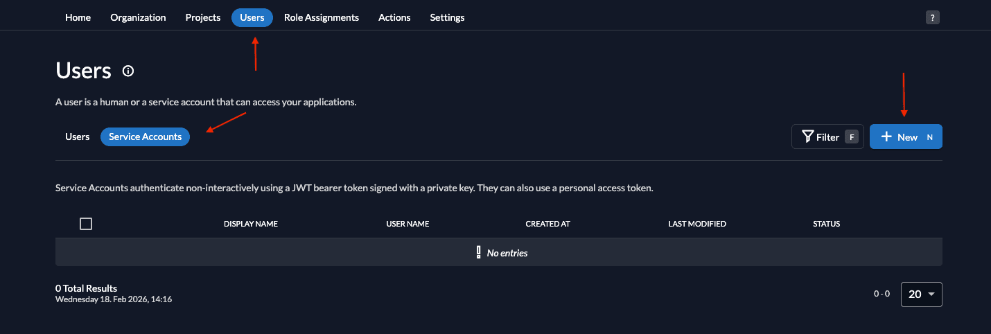 On the user view, switch to Service Accounts and create a new one.