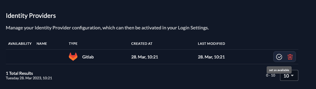Once you created the provider, it is listed in the providers overview. Activate it by selecting the tick with the tooltip set as available.