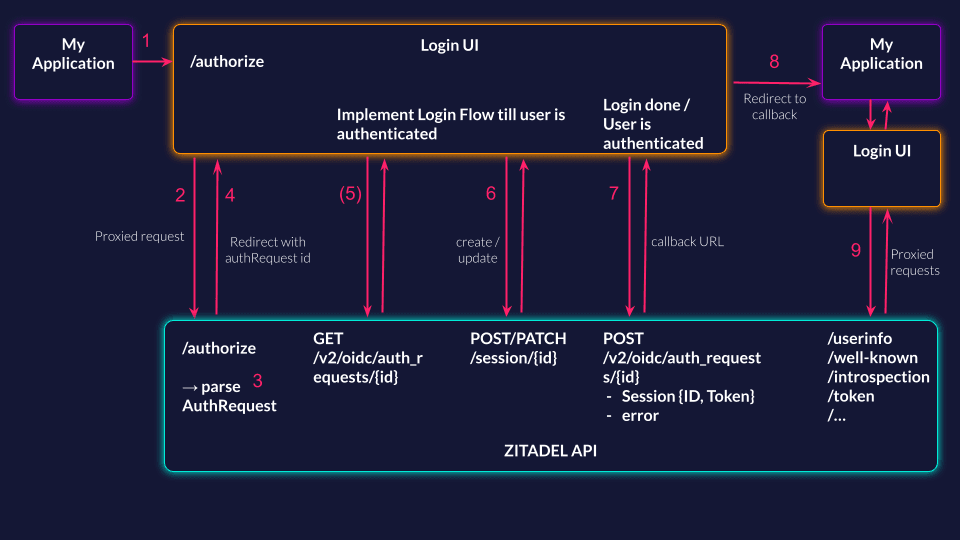 - All OIDC-specific endpoints have to be accepted in the Login UI and should be proxied and sent to the ZITADEL API