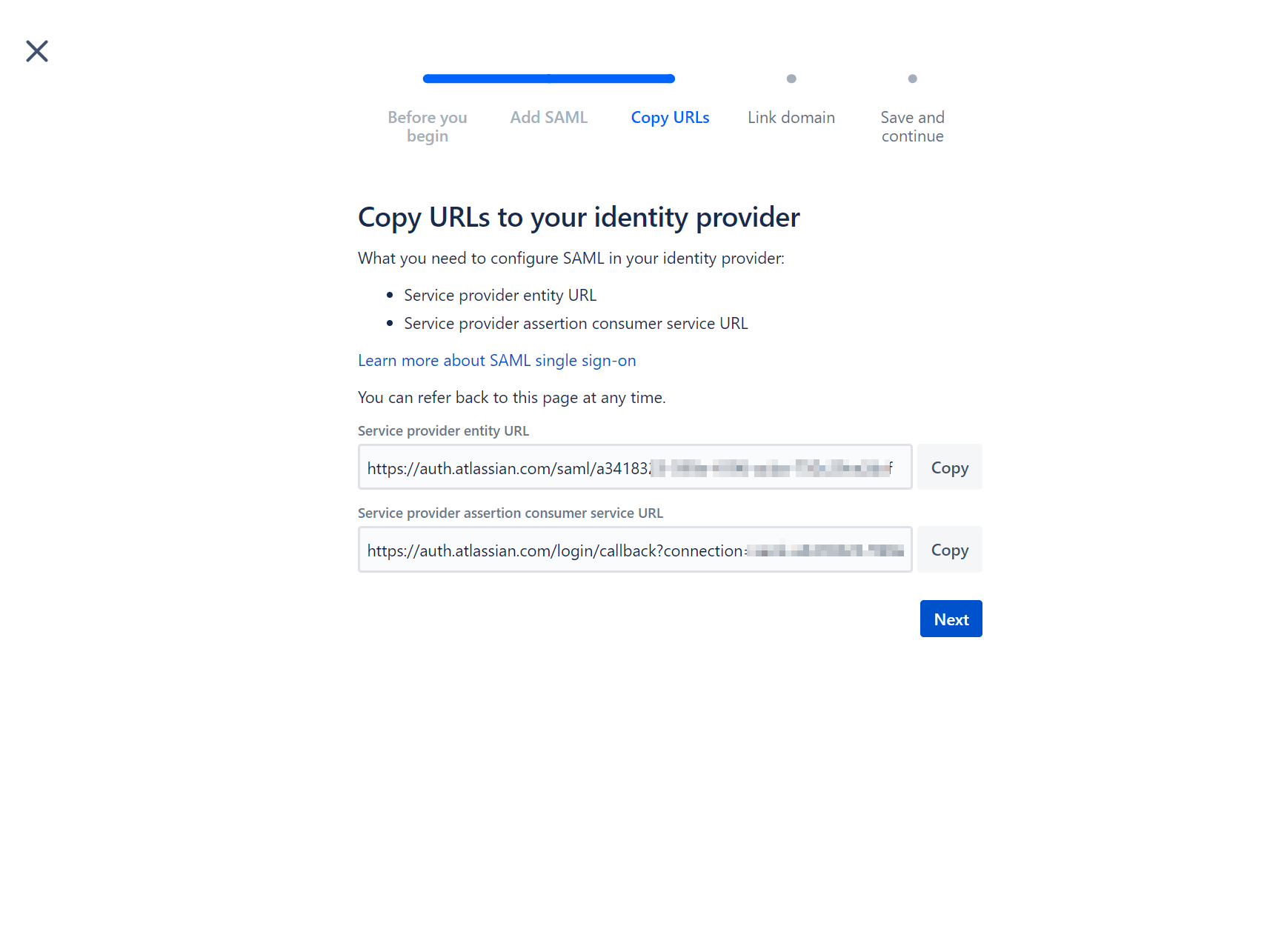 Please follow the instructions on Atlassian's support page to configure a SAML identity provider for SSO. The following instructions give you a quick overview of the most important steps.