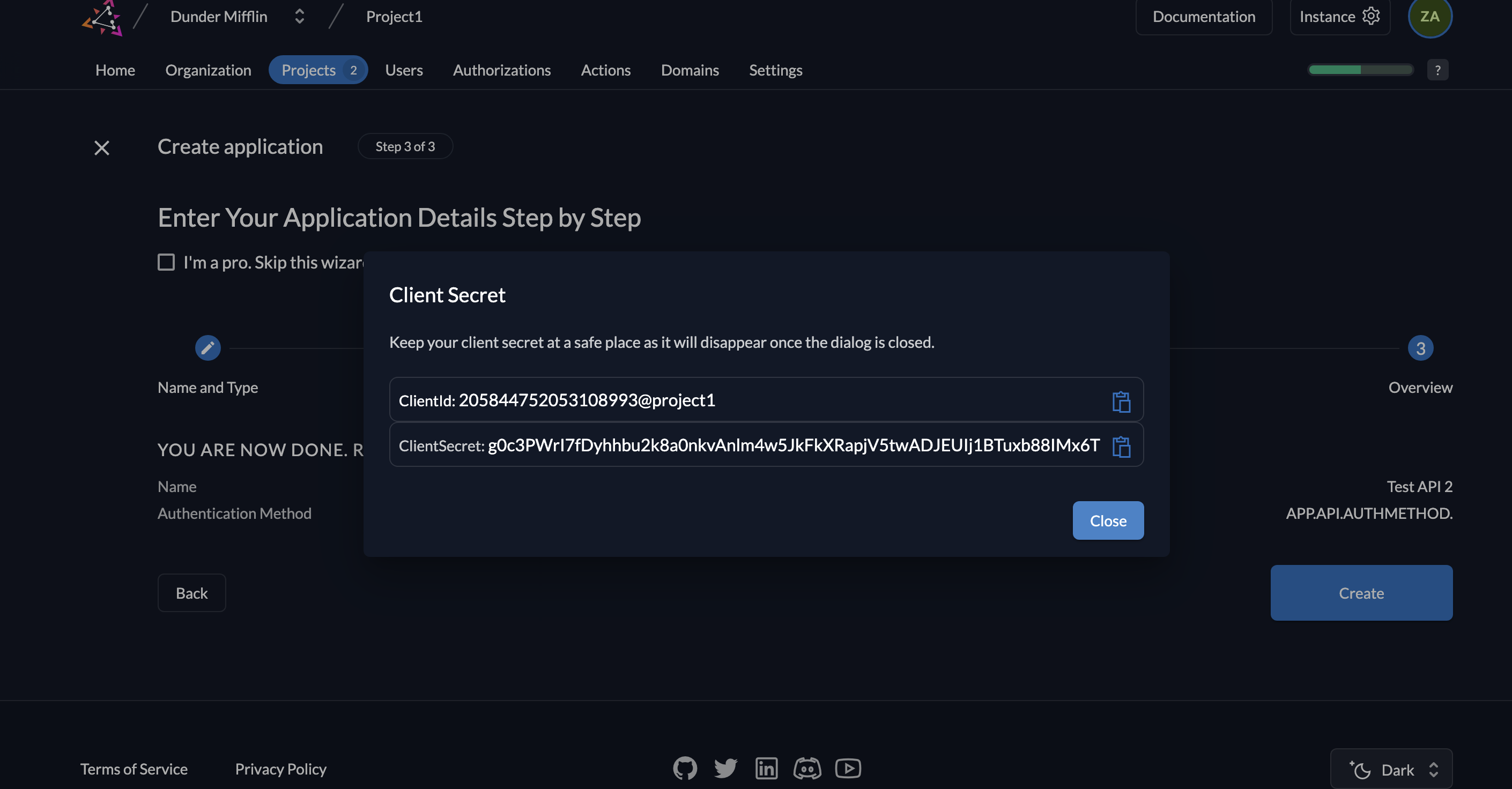- You will now see the API’s Client ID and the Client Secret. Copy them and click Close.
