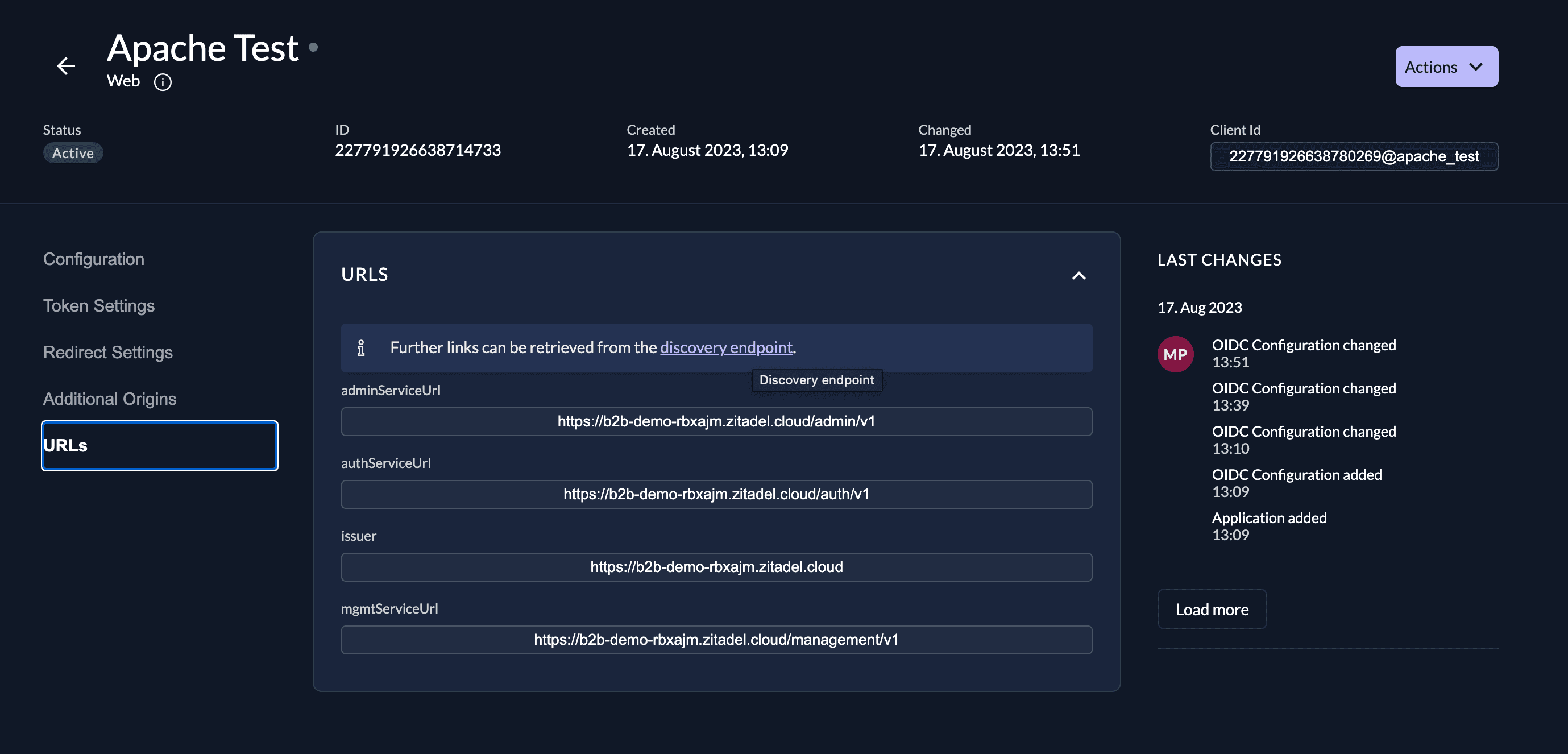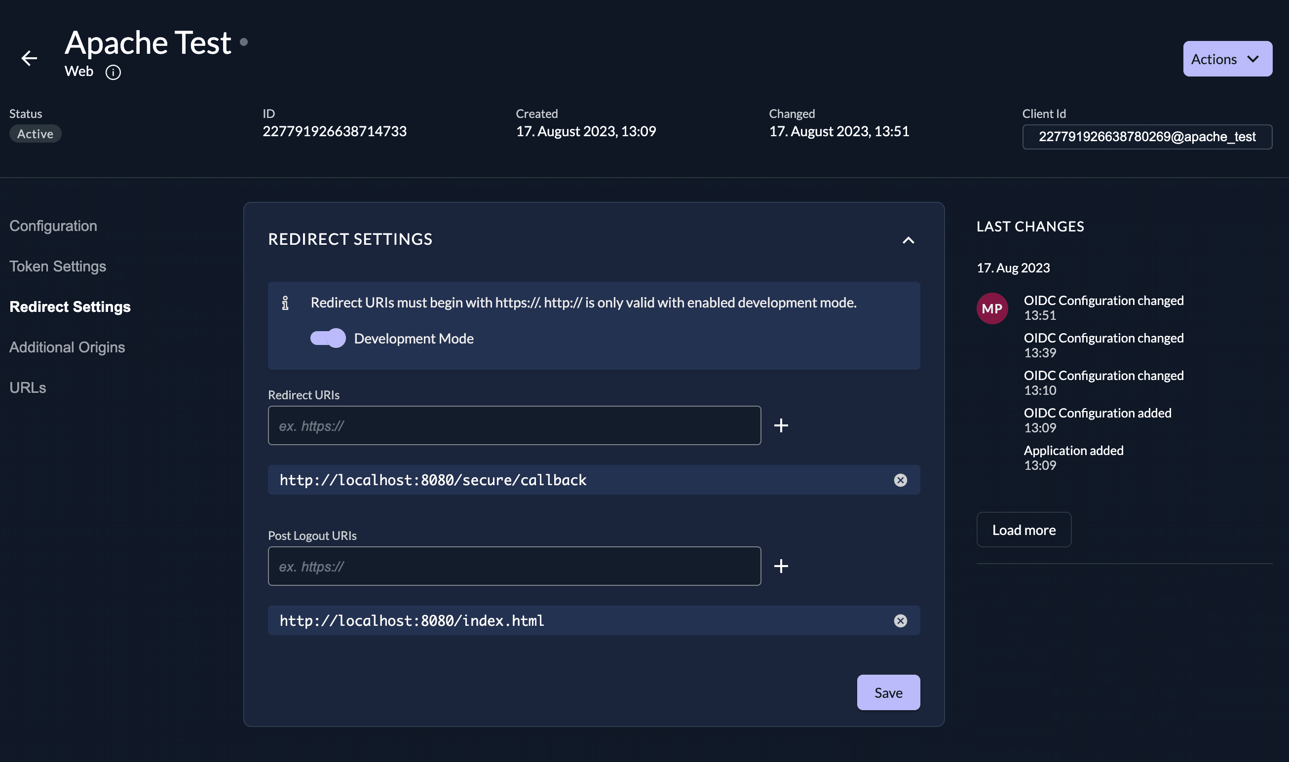OIDCClientIDIs the ID of the zitadel application. You can find it on the settings page of the application.123456789123@apache_test