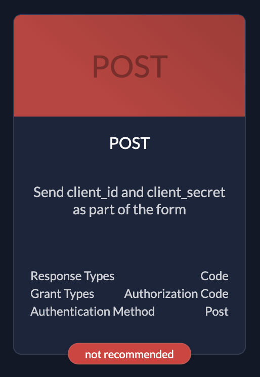 ![]() | PostOnly use if you have no other possibilities. Client id and client secret in request body |