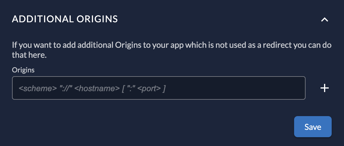 If your application makes requests from domains other than the Redirect URI (e.g., a Javascript app fetching data from an API on a different domain), you can specify them here to configure CORS (Cross-Origin Resource Sharing).