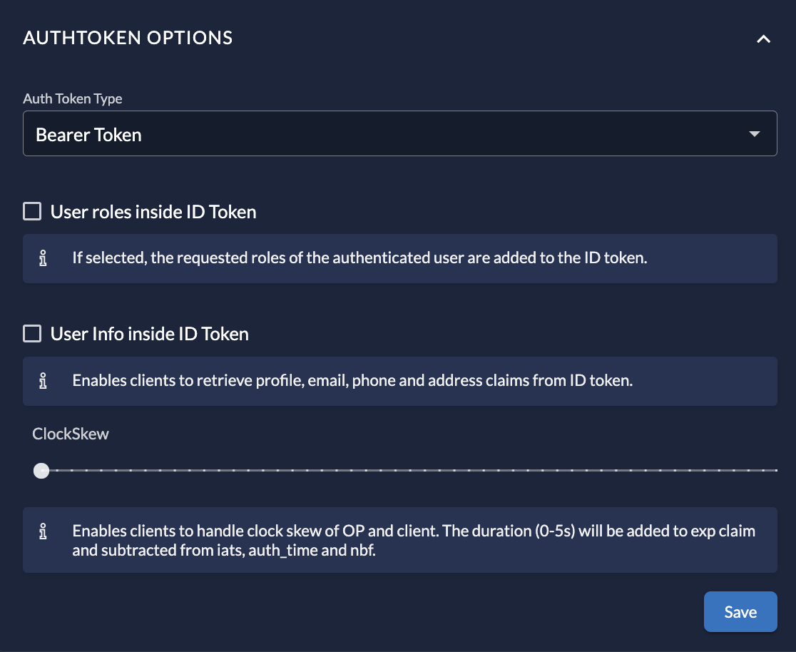 - ClockSkew: Optionally set a time buffer added to the expiration time of the issued token to handle server time differences.