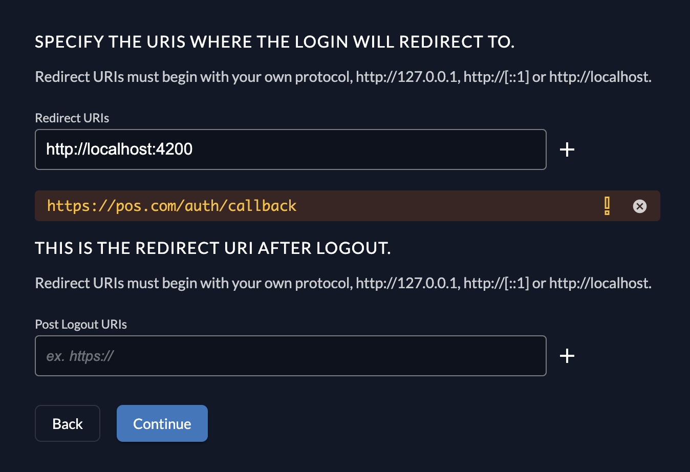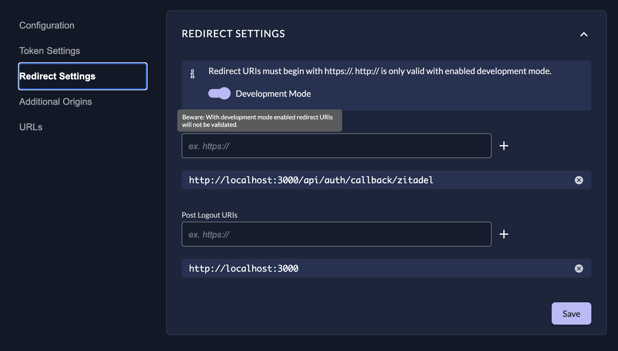 - Security: ZITADEL strictly checks these URIs during the login process. They must match exactly what is defined in your application code.