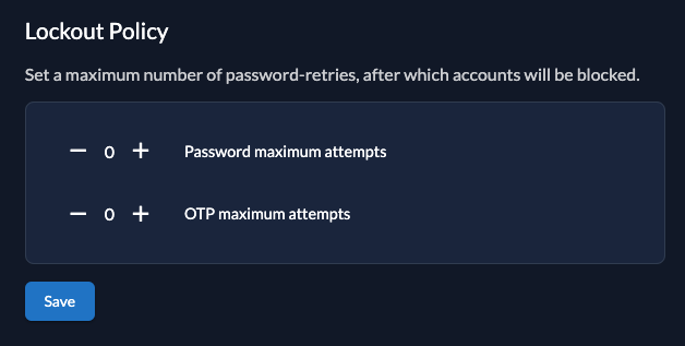 - Lockout: Set the maximum attempts a user can try to enter the password or any (T)OTP method. When the number is exceeded, the user gets locked out and has to be unlocked.