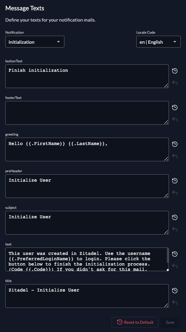 | Initialization | The mail after a user has been created. A code is part of the message which then must be verified on first login |