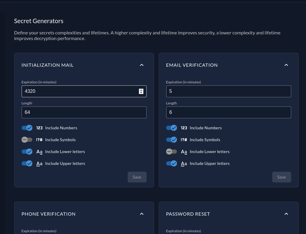 - Secret Generator: Appearance and expiration of the generated codes and secrets used in mails for verification etc.
