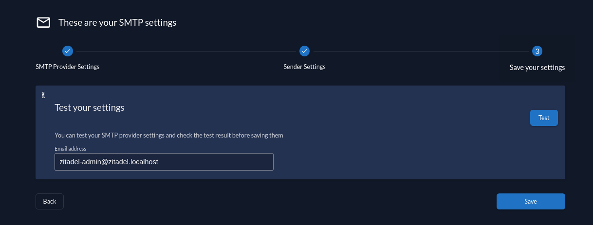 While you create/update a SMTP provider you have the chance to test your SMTP settings