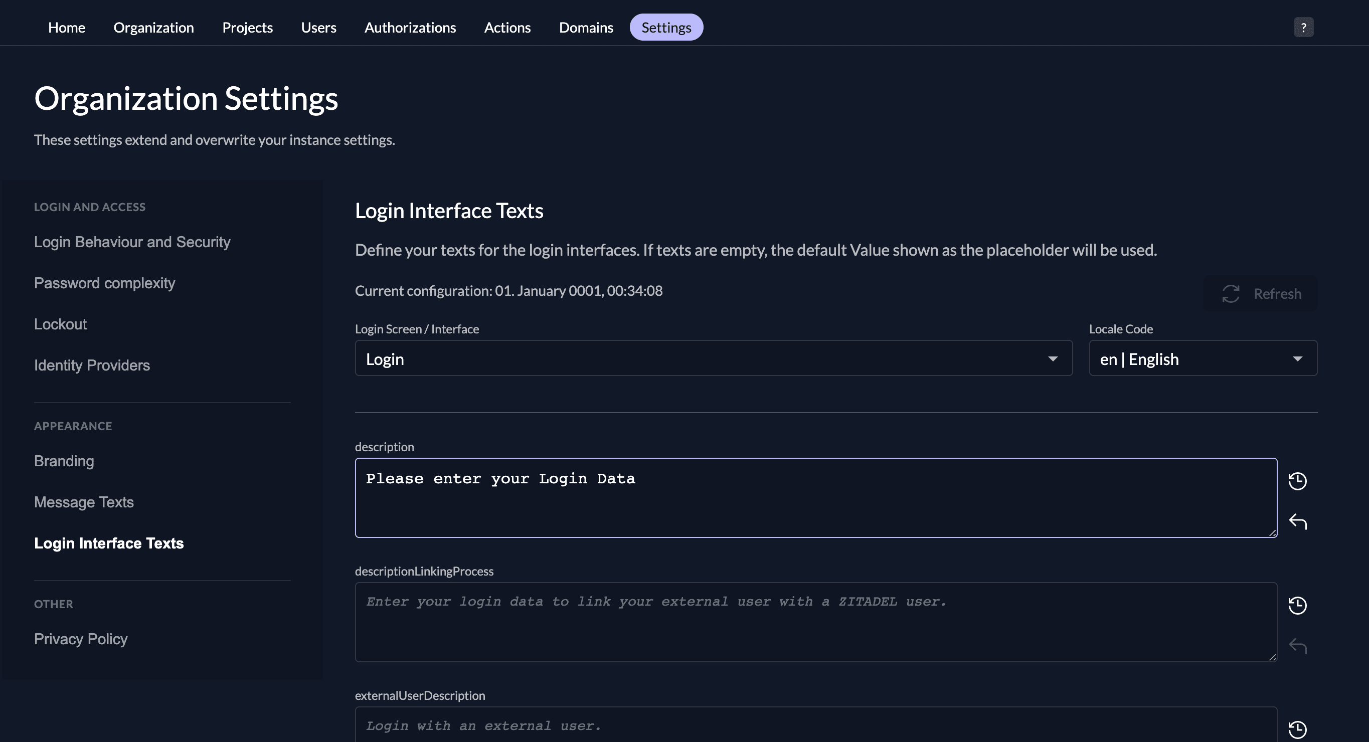 Like the message texts you are also able to change the texts on the login interface. First choose the screen and the language you like to edit. You will see the default texts in the input field, and you can overwrite them by typing into the box.